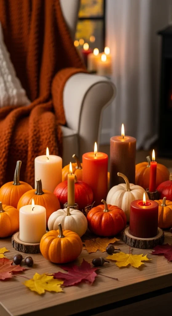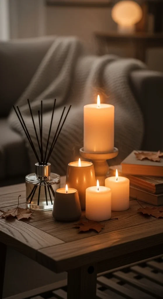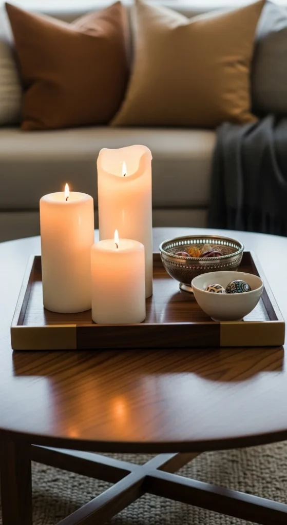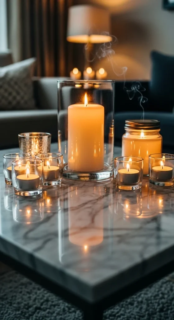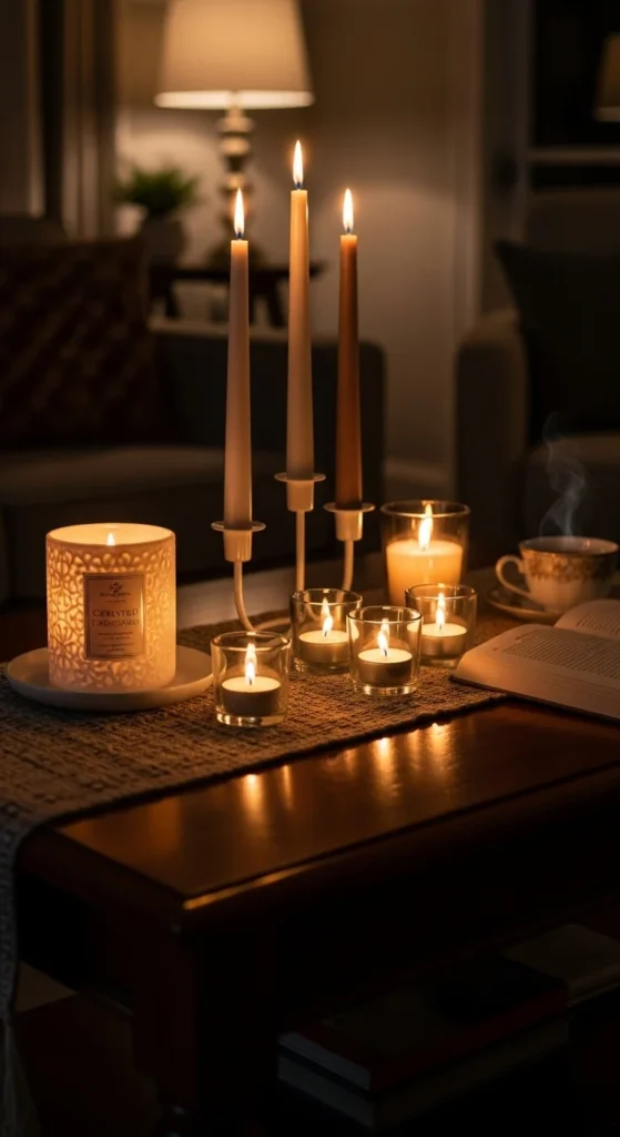 Candles create cozy mood lighting. Use different heights for dimension—tall tapers, short votives, or pillar candles. Opt for subtle scents like vanilla or sandalwood to complement your space.