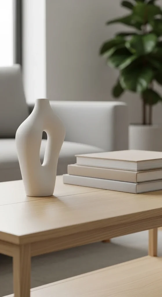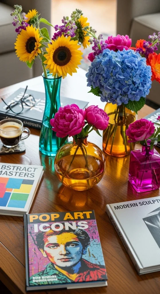 If your living room is neutral, let your coffee table shine with color. Bright flowers or art books inject vibrancy without overwhelming the space.
