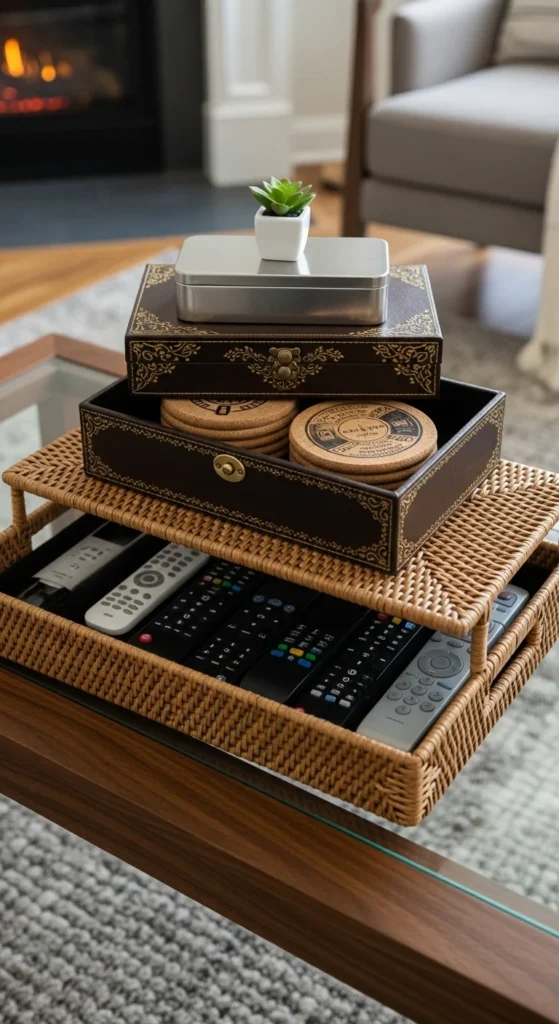 Decorative boxes keep clutter out of sight. Use them to store small essentials while adding height and style to your display.