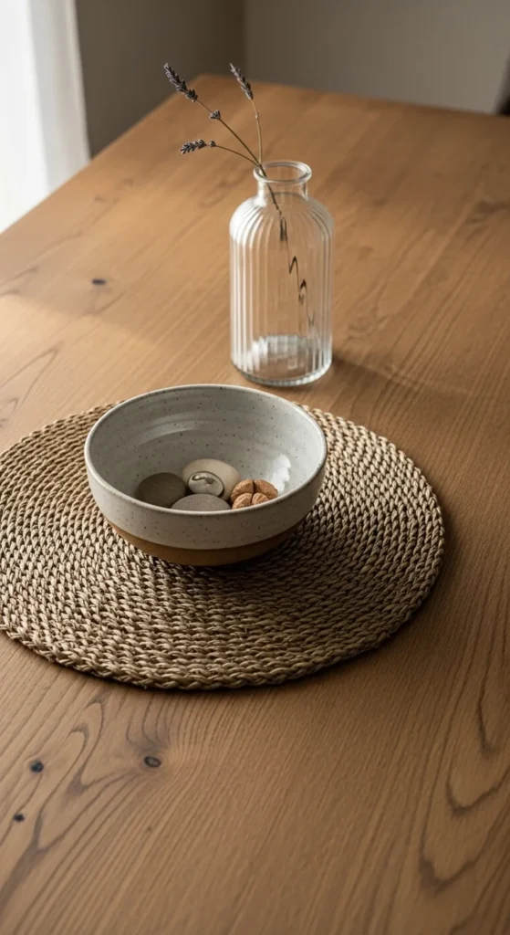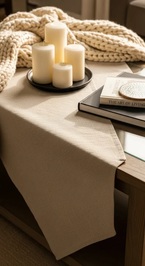 Soft fabrics add comfort. Use a linen runner, small throw, or macramé doily to introduce texture and coziness without cluttering the surface.