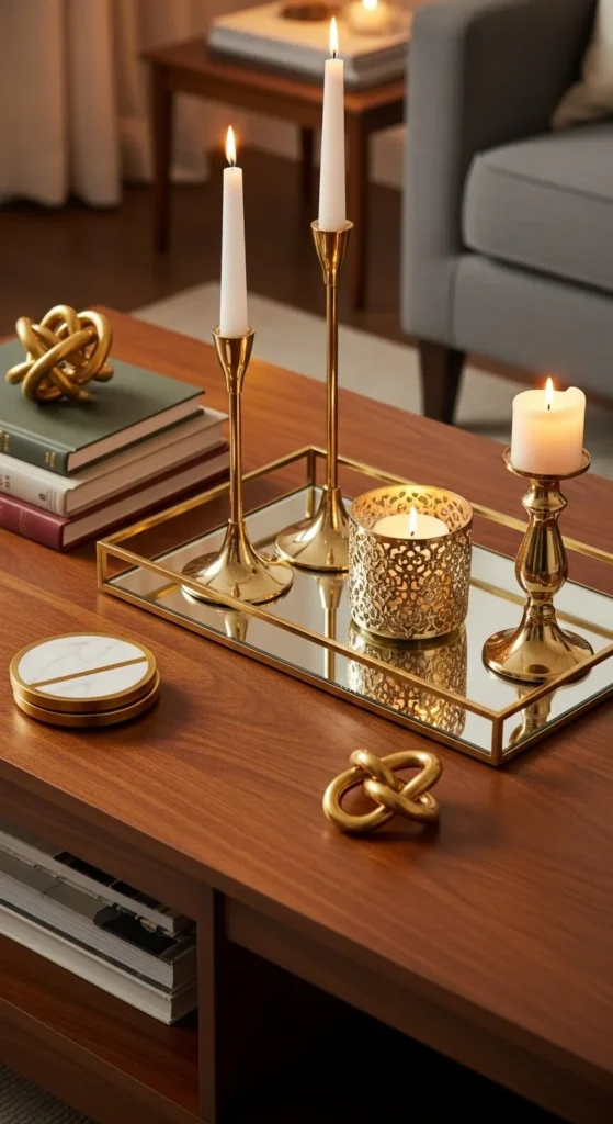 A little metallic shine adds elegance. Mix gold or brass pieces with neutral decor for warmth. Just one or two shiny accents can elevate the entire setup.