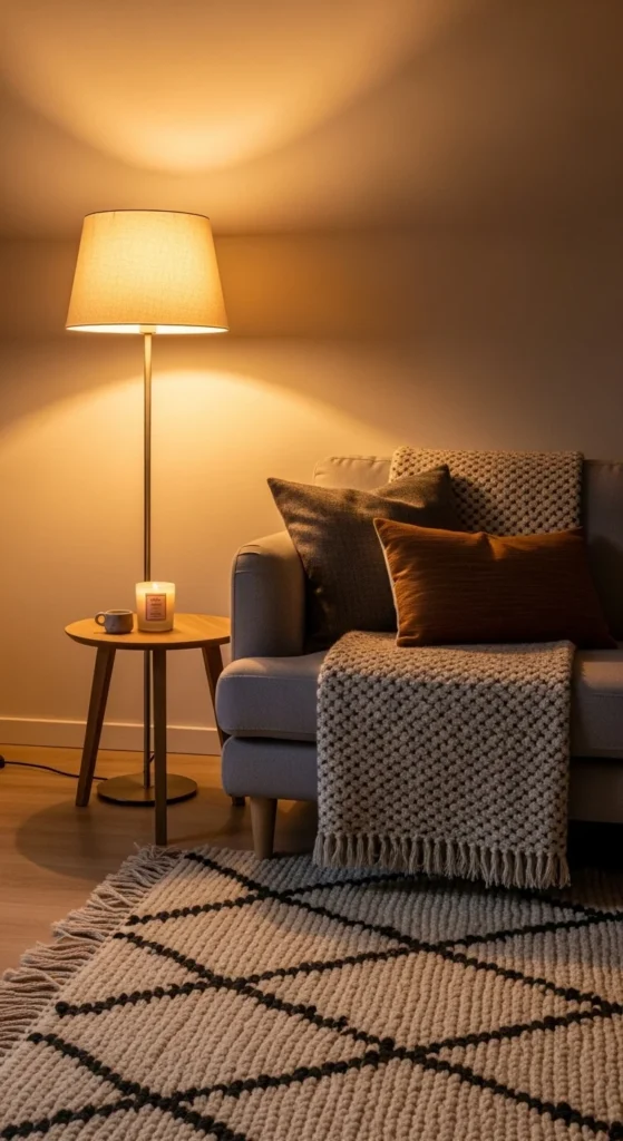 Cozy lighting looks best when it interacts with textures — think knitted blankets, woven baskets, linen curtains, or raw wood finishes. Light naturally softens and enhances these materials.