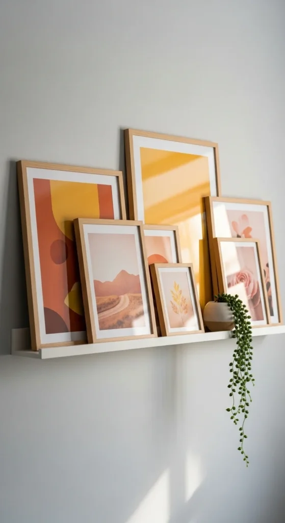 This is the fun part! Styling gallery shelves is all about layering, balance, and variety. The goal is to make the arrangement look intentional, not cluttered.