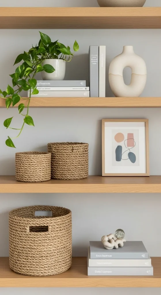 Not everything belongs on display, and that’s where baskets and containers save the day. They keep the shelves tidy while still adding style.
