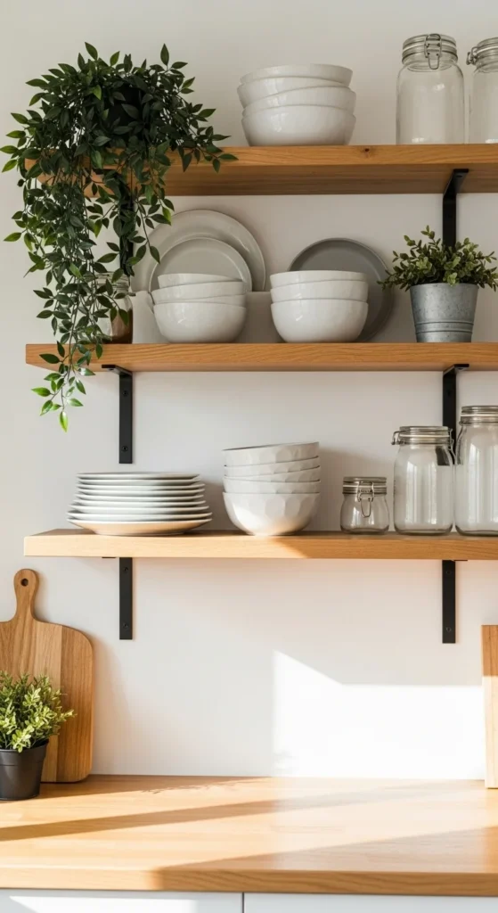 Plants instantly upgrade open shelving by adding softness and natural movement. Choose plants that trail or stand upright depending on your design vision.