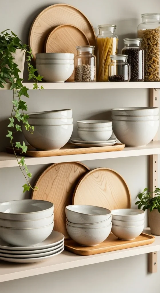 Natural colors and textures help open shelves feel cohesive and calming. Choose a color palette and stick to it.