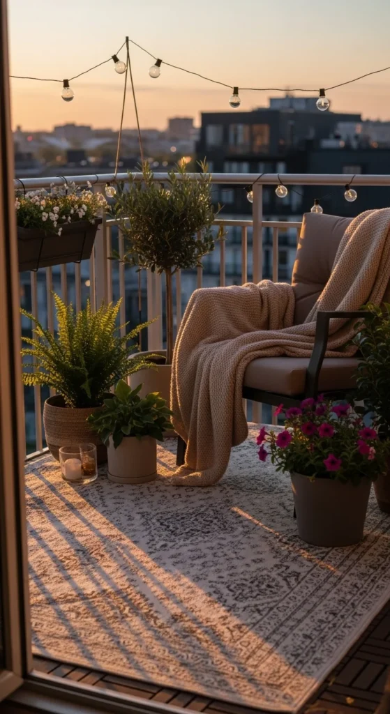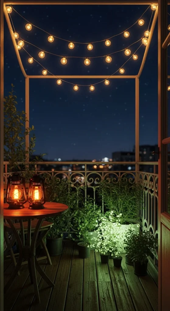Nothing transforms a balcony like lighting. Warm, soft lights instantly make the space feel cozy and romantic after sunset.