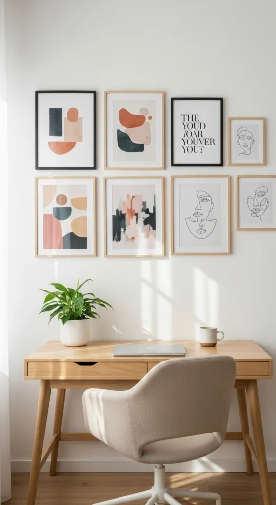 Choose frames and sizes that complement your office style. A large art piece can serve as a bold statement, while smaller pieces can be arranged into a curated gallery wall.