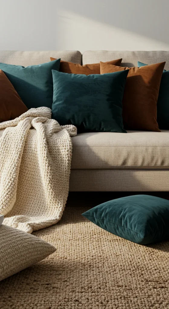 - Velvet or linen cushion covers