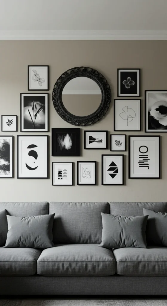 - Mix framed prints, mirrors, or floating shelves.