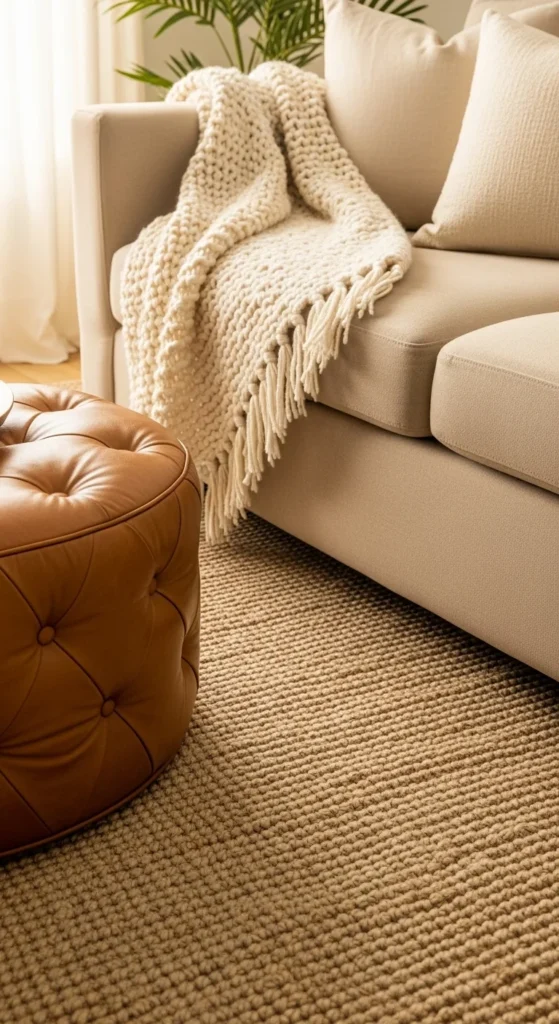 • A woven jute rug under a linen sofa.