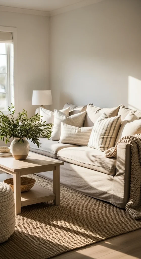 The secret to a rich, dimensional look lies in layering multiple shades of the same color family. Instead of sticking to all beige or all white, mix tones like ivory, taupe, greige, and soft tan.
