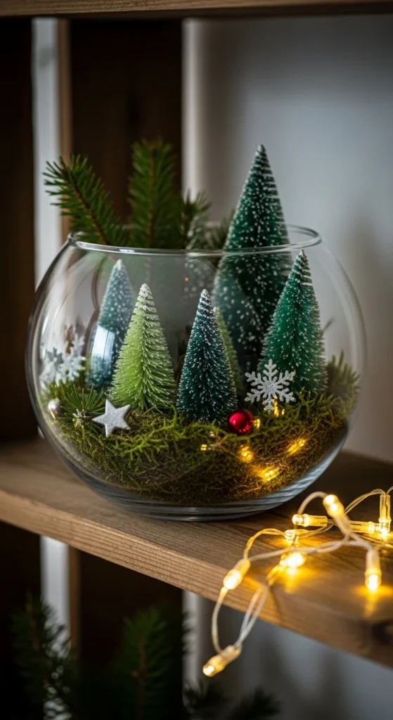 Terrariums bring natural charm into your home. Use a clear bowl, jar, or vase. Fill the bottom with pebbles or coarse salt to mimic snow. Add small sprigs of pine, mini trees, or tiny ornaments. These terrariums look beautiful on mantles, coffee tables, or sideboards. You can keep them minimal or add several layers for depth. Use items you already have at home to keep costs low. If you have leftover fairy lights, tuck a few inside for a gentle glow. These terrariums also work well after Christmas by removing the ornaments and keeping the greenery. They’re easy to assemble and require no special tools. Mix different sized containers for a collected look.