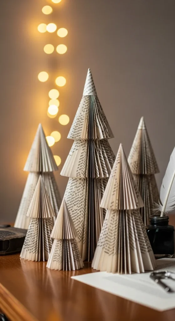 Book page trees are lightweight, charming, and perfect for neutral-colored décor. Use old book pages or scrap paper. Roll them into cones or fold them accordion-style and glue them to form a tree shape. Add a simple wooden bead or star on top. These trees look lovely on desks, shelves, and side tables. The soft paper texture fits well with natural décor styles. If you want more contrast, lightly brush the edges with gold or silver paint. You can make several trees in different heights for a pretty display. This project is great for recycling worn-out books or papers you no longer need.