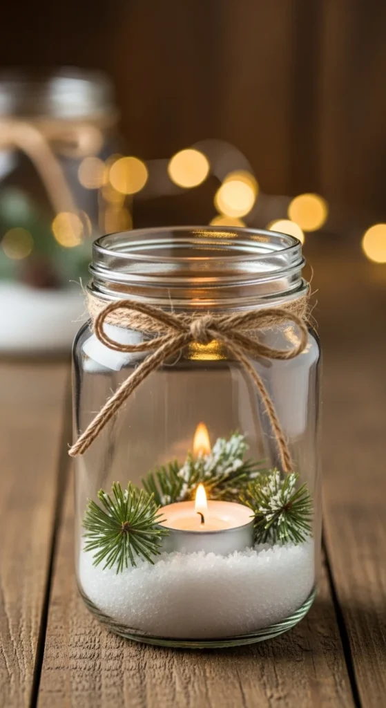 Mason jar lanterns add gentle winter charm to tables, shelves, and windowsills. Start with any leftover glass jars you already have. Add a small layer of faux snow or coarse salt to mimic a frosty base. Place a battery tea light inside for a soft glow. Tuck a small pine sprig or tiny ornament along the side of the jar for texture. Wrap the rim with twine or ribbon for color. These lanterns are flexible because you can customize each one depending on what you have at home. Group three jars together for a centerpiece, or place single jars near plants or books for subtle holiday accents. This project works well for last-minute decorating because assembly takes only a few minutes. You can also reuse the jars after the season ends by washing them out. If you prefer a snowy finish, lightly brush school glue on the outside and sprinkle fine salt or sugar for a frosted look. It creates a soft shimmer under warm lights without buying expensive supplies.