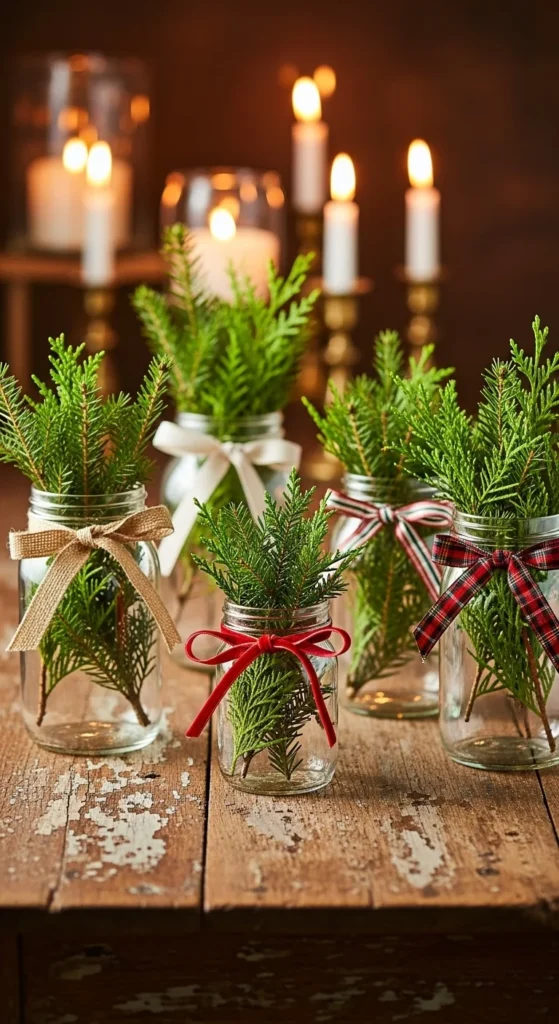 Evergreen jar bouquets bring natural fragrance and color to your home. Collect small pine or cedar branches and place them in jars filled with water. Tie a ribbon around each jar for a finished look. These bouquets look beautiful on mantles, desks, and shelves. Swap out the water every few days to keep the greens fresh. This project is simple and nearly free if you gather branches outdoors. You can group jars together for a fuller arrangement or keep single jars in small spaces. Add cranberries to the water if you want a pop of color.