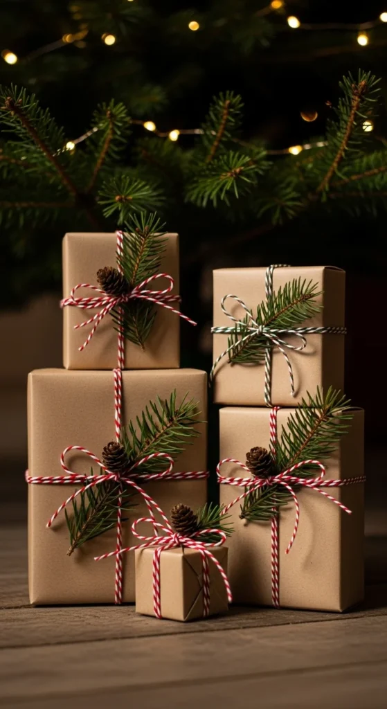 Wrapped gift boxes work as simple, charming décor. Use empty boxes you already have and wrap them in brown or colored paper. Add ribbon, twine, or small pine sprigs for detail. Stack the boxes near the tree, on shelves, or under a console table. These “decorative gifts” add color and structure without requiring actual presents. You can choose any size and style depending on your space. This project is extremely affordable and great for filling larger areas.