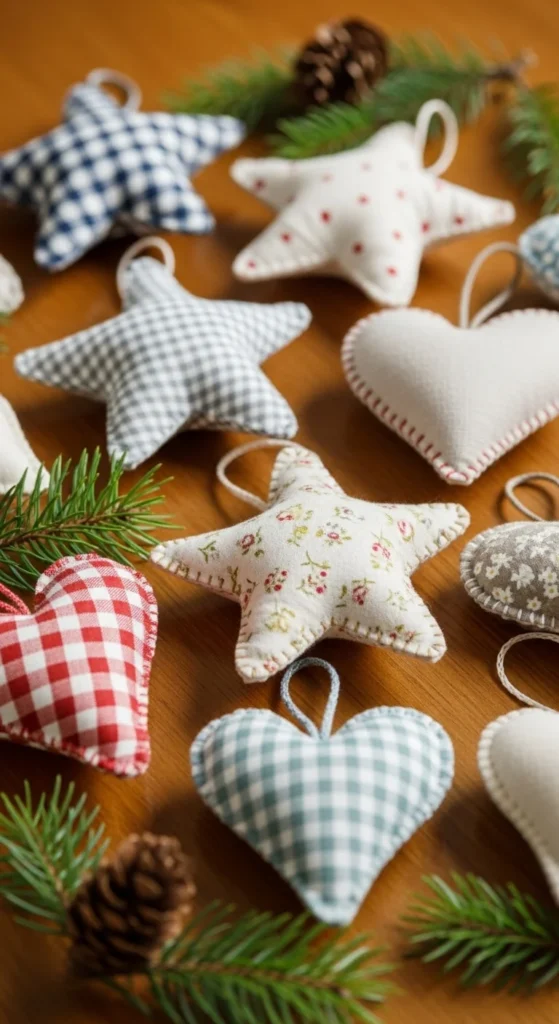 Scrap fabric ornaments are perfect if you enjoy simple sewing or craft glue. Gather leftover fabric pieces from old shirts, pillowcases, or project scraps. Cut them into basic shapes like stars, circles, or trees. You can stitch the edges or glue them together if you prefer no-sew crafting. Stuff them lightly with cotton or fabric bits to add volume. Add ribbon loops so you can hang them on the tree or doorknobs. These ornaments feel warm and soft, and each one becomes unique depending on the fabric pattern. If you enjoy themed color palettes, stick to two or three tones for a cohesive look. You can decorate the surface with tiny buttons, scrap lace, or painted dots. Kids can help trace the shapes and glue the pieces, making this a very family-friendly holiday activity. This project helps you use materials that would otherwise be thrown away, giving them new life on your Christmas tree. They also make sweet handmade gifts for friends and neighbors.