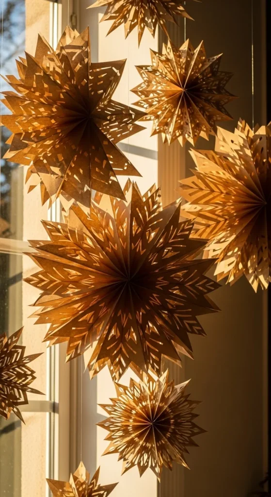 Paper bag snowflakes create impressive wall or window décor with almost no cost. All you need are paper bags, glue, and scissors. Stack several bags in a neat pile, glue them together in a simple pattern, and cut shapes along the edges. When you unfold them, you get large, detailed snowflakes that look handmade and festive. Hang them with clear string or tape them to a wall for instant holiday charm. These snowflakes work well for parties, living rooms, and entryways. They take up big visual space, making them ideal if you want dramatic décor without buying expensive pieces. Use white bags for a clean winter look or brown bags for a rustic style. You can make large ones for statement pieces and smaller ones for accents. This activity is easy for kids too, especially if you draw cutting lines for them. Make a set in different sizes and layer them for a cozy winter backdrop.