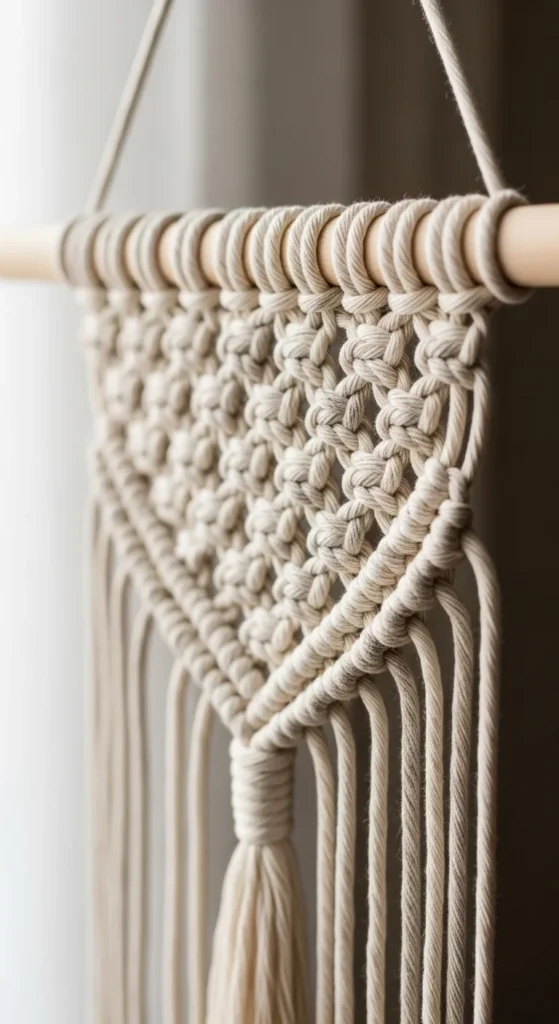 Use leftover rope to create a tiny macrame wall hanging. Basic square knots and loops are enough. Hang it on a wooden dowel. This works well for small spaces or gallery walls. The texture softens the room and costs almost nothing.