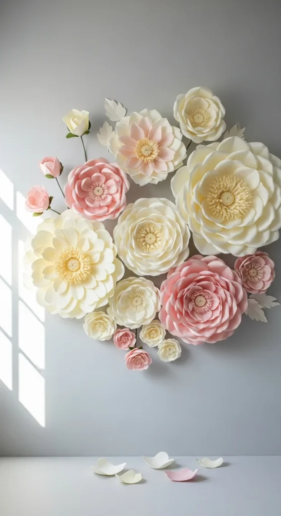 Create paper flowers using colored sheets. Fold, curl, and glue pieces into layered petals. Attach the flowers to the wall using tape. This works especially well for bedrooms or event setups. Use soft pinks, beige, or white for a calm look.