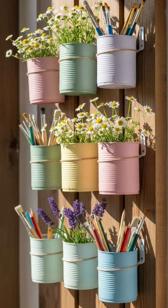 Clean old tin cans and paint them. Attach them to a wooden board or hang them individually. Use them for flowers, pencils, or kitchen tools. This project is both decorative and useful.