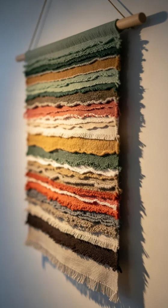 Fabric leftovers can turn into a warm tapestry in minutes. Cut pieces into long strips and knot them onto a wooden dowel or a fallen branch. Let the strands hang at different lengths for movement. This project works well with cotton, linen, or old shirts. If you want more shape, trim the bottom into a “V.” Add simple beads or dried leaves if you want a natural touch. Tie a cord on each end of the dowel and hang it from a small hook. This design brings softness to bedrooms or reading corners. It also helps fill large blank walls without spending money on décor from stores.