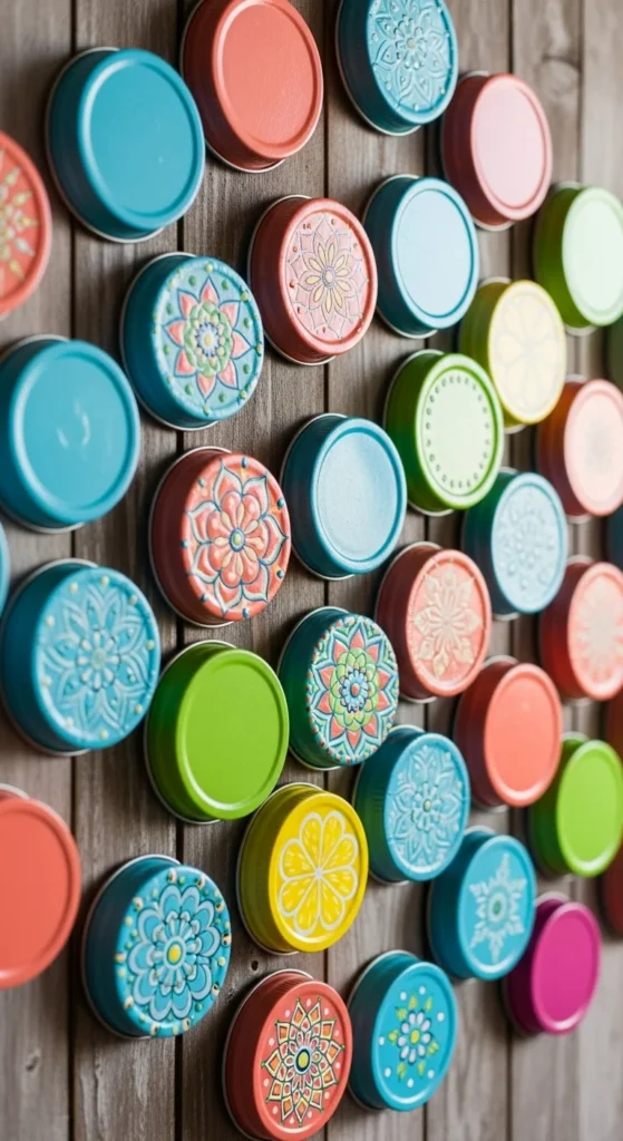 Paint the lids in similar tones. Stick them on the wall in a circular or scattered layout. This creates a fun, textured display.