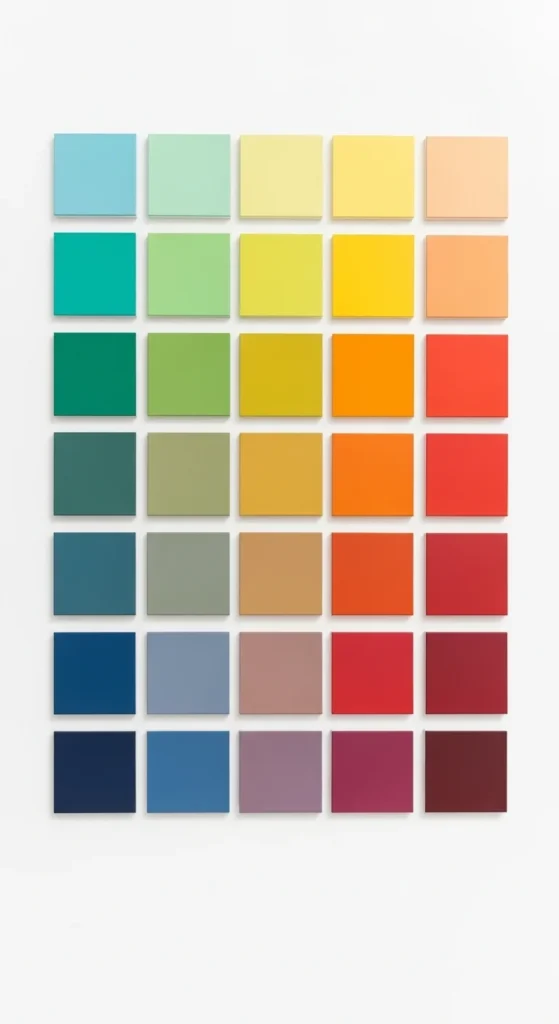 Collect paint sample cards in tonal families. Mount them in rows or fade them from dark to light. The result acts like colorful artwork.