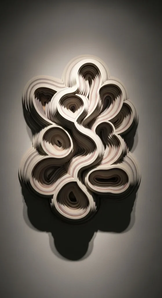 Paper is affordable and extremely flexible. Cut simple curved shapes or geometric pieces from colorful paper. Layer them on white cardstock to create a soft three-dimensional effect. Frame the sheet or hang it as-is. Play with color combinations until you get a balanced look. This style suits modern interiors. You can switch colors for seasonal decorating. All you need is paper, scissors, and glue.