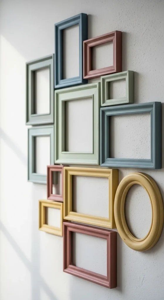Old frames become stylish accents once repainted. Remove the glass and backing. Paint the frame in a matte shade or distress the edges for texture. Arrange several frames in a cluster. Mix sizes to create visual interest. Leave the center empty for a minimalistic look. This arrangement adds dimension without effort or cost.