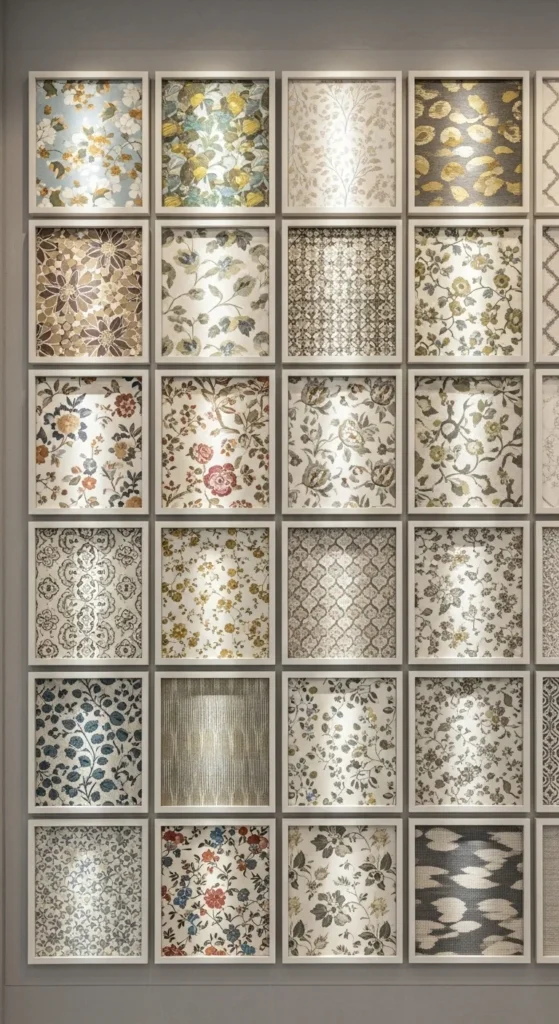 Wallpaper samples often come free. Cut them into large squares and mount them on foam board or inside frames. Arrange them in neat columns for a patterned gallery wall. Rotate them each season for fun. This project covers large areas without buying full wallpaper rolls.