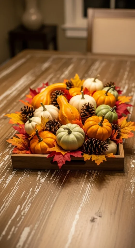 1. Rustic Pumpkin Tray Centerpiece