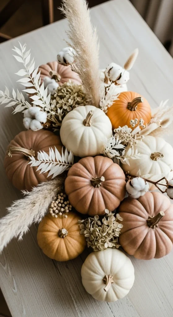 Neutral pumpkins offer a calm fall look without strong color. Choose shades of cream, beige, or pale gray. Arrange them in a loose cluster across the center of your table.