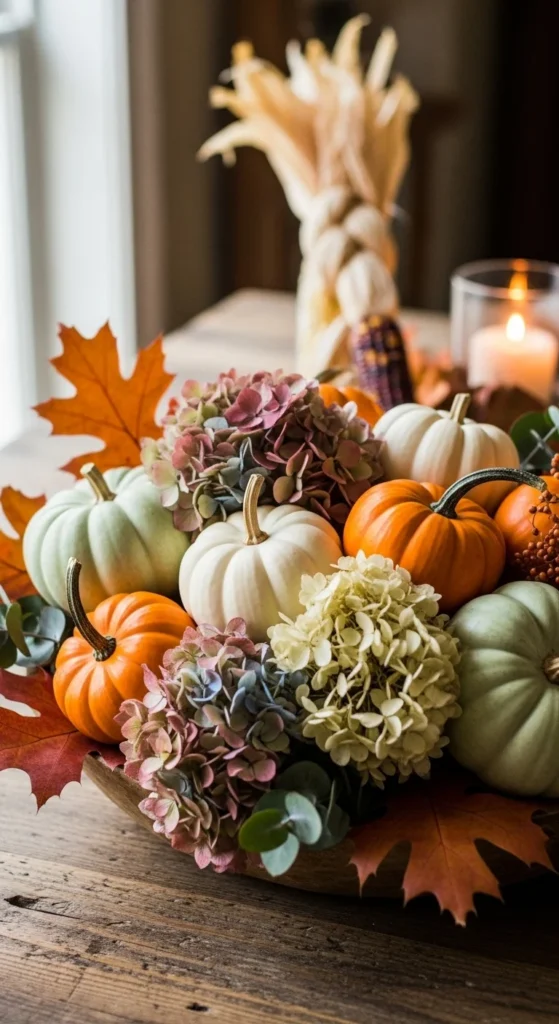 Pumpkins and dried hydrangeas look beautiful together. Place a few pumpkins in a shallow bowl, then tuck hydrangea heads between them. Choose hydrangea colors that match your fall palette—cream, faded pink, or soft green.