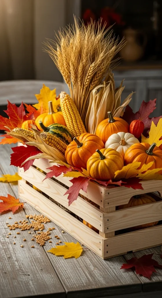 A small wooden crate creates a charming harvest display. Fill it with pumpkins, dried corn, wheat bundles, and small branches. The mix of textures makes it feel rich and seasonal.