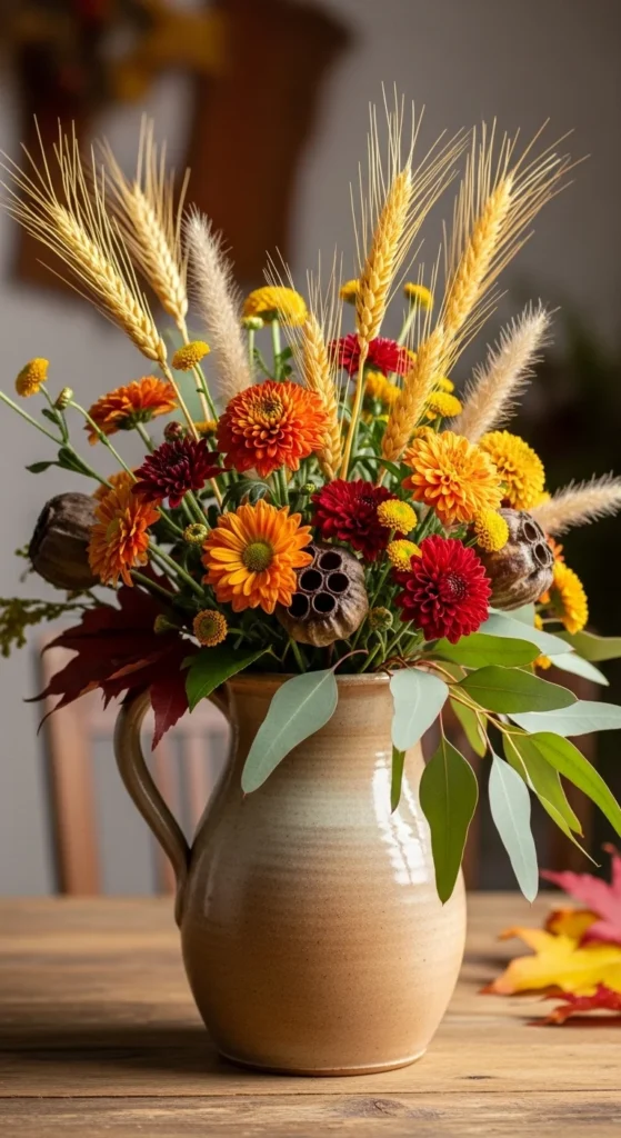 A ceramic pitcher filled with fall florals can instantly warm your table. Choose flowers like mums, sunflowers, or dried wheat. Mix heights to keep the arrangement natural.