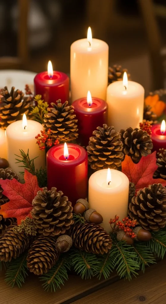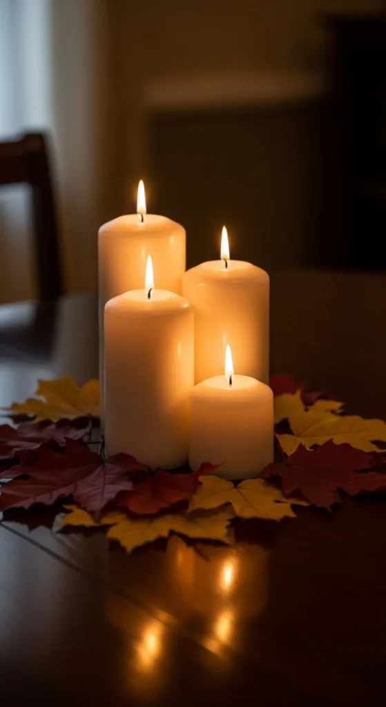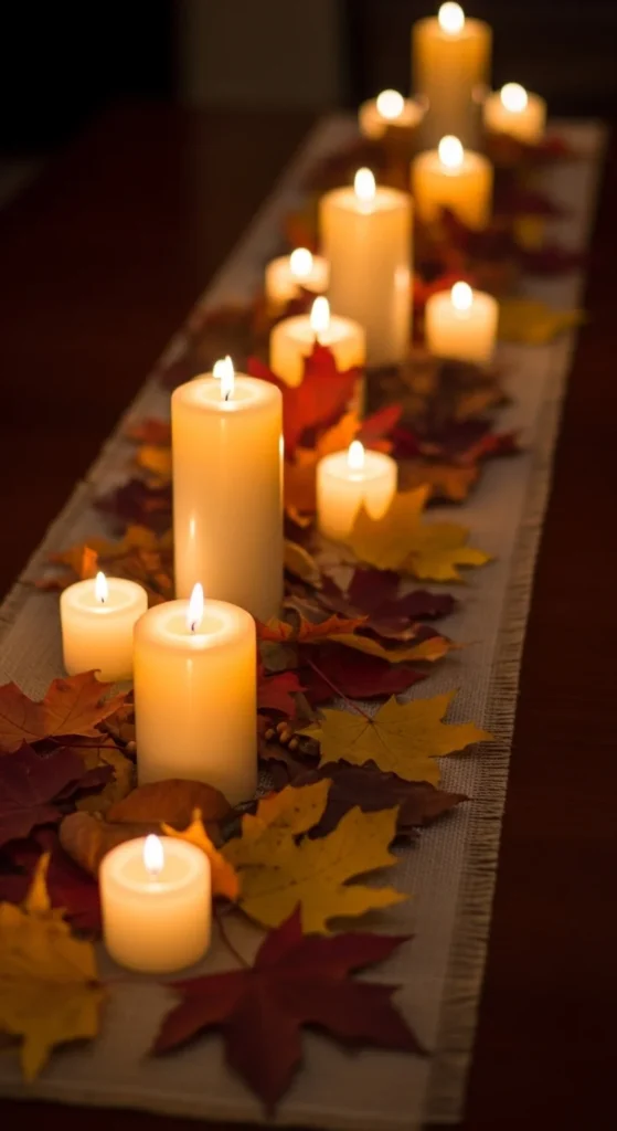 Lay a simple runner across your table and arrange candles along the center. Scatter leaves around them for color. Keep the candles spaced evenly for a clean look.