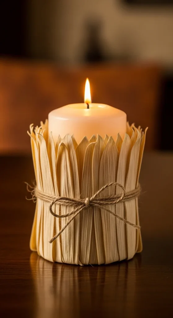 Corn husks can dress up a simple candle in a creative way. Wrap dried husks around a candle holder and tie them with twine. The texture brings instant fall charm.