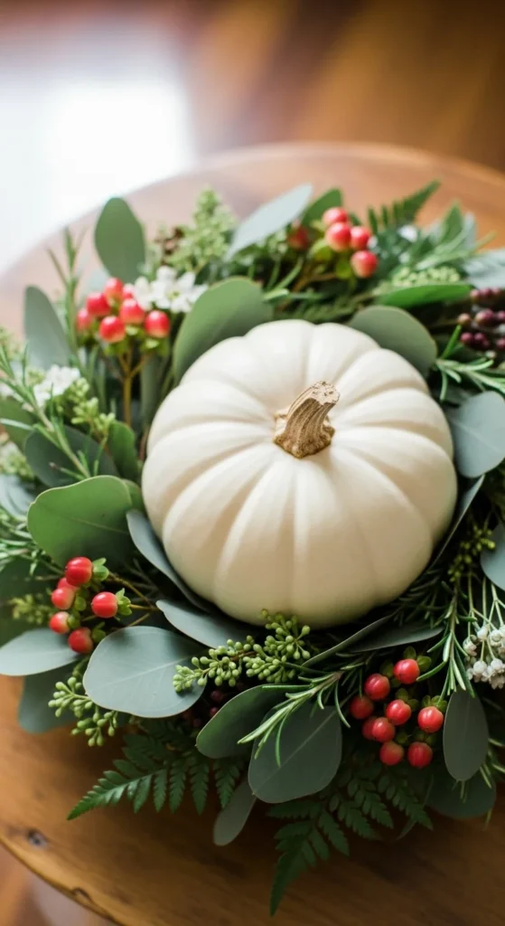 A single white pumpkin surrounded by greenery creates a clean fall look. Place the pumpkin in the center of your table and arrange eucalyptus or soft leaves around it in a circular shape.