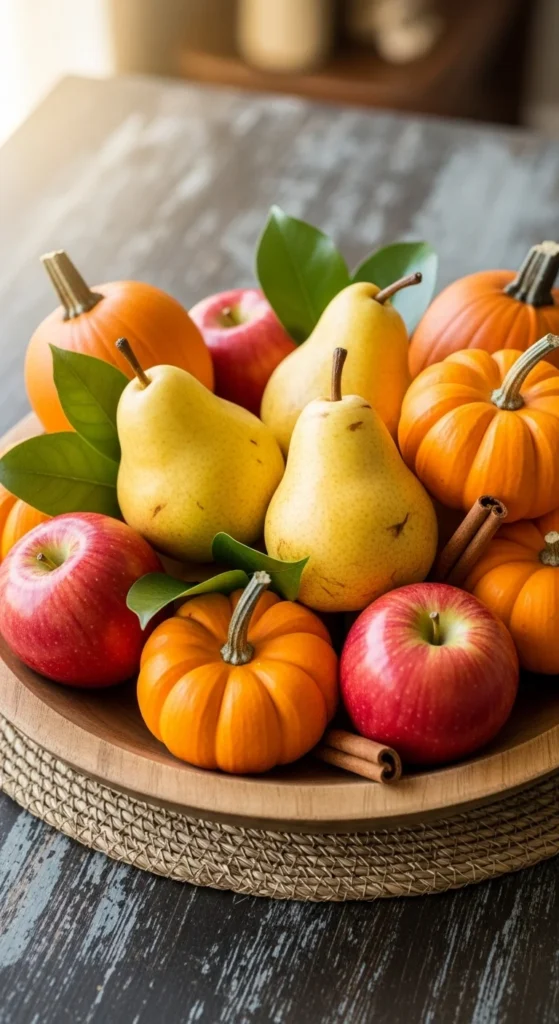 A bowl of fall fruit brings natural color to your table. Fill a ceramic or wooden bowl with pears, apples, and mini pumpkins. Mix sizes and shades for interest.