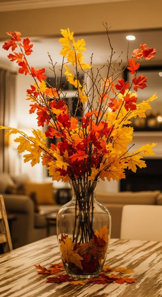 Tall fall branches add height and shape to your table. Place a few inside a large glass vase. Choose branches with warm-colored leaves for seasonal style.