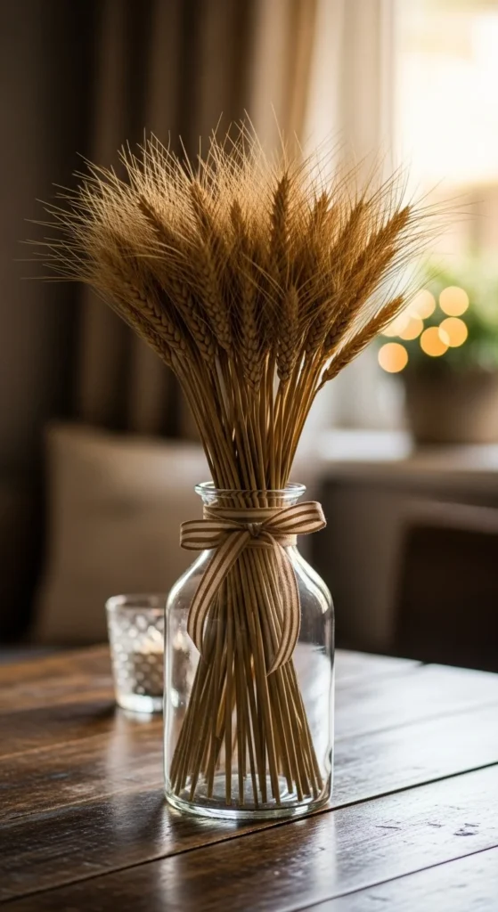 You can buy wheat bundles cheaply or reuse ones from past seasons. If the wheat spreads out too much, secure the base with a small rubber band before placing it in the vase. This keeps the shape tidy.