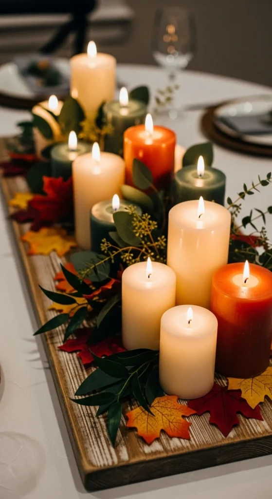 A simple wooden board can turn into a beautiful centerpiece with the help of candles and fall greenery. Place pillar candles of different heights along the board. Tuck small leaves or branches in between each candle for color.