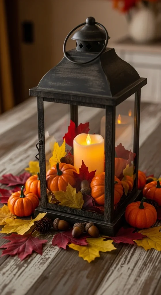 A lantern makes a perfect frame for fall details. Open the door and place a candle inside, then add small pumpkins or scattered leaves around it. Choose a lantern style that matches your table—black for modern, wooden for rustic, or gold for elegant.