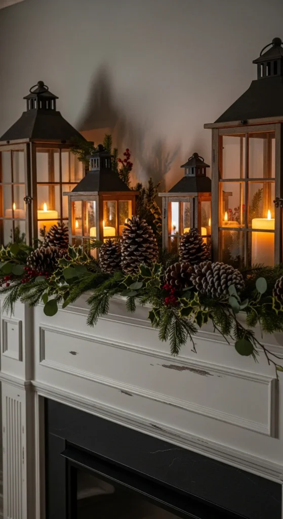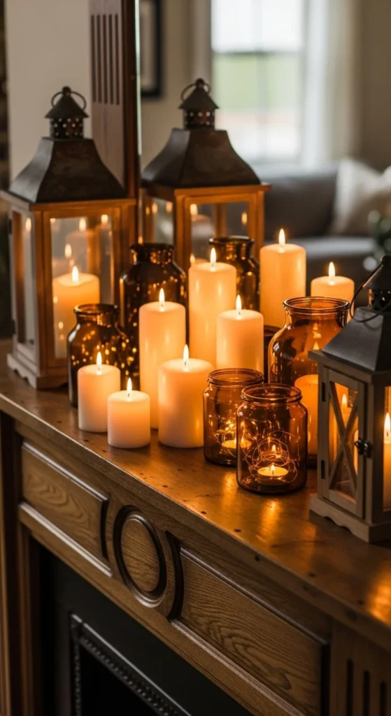 Lanterns are timeless and cozy. Place one or two on each end of the mantel and fill them with candles. Add small pinecones or leaves around the base for detail. The soft, glowing light creates a comforting ambiance that feels perfect for chilly fall nights.