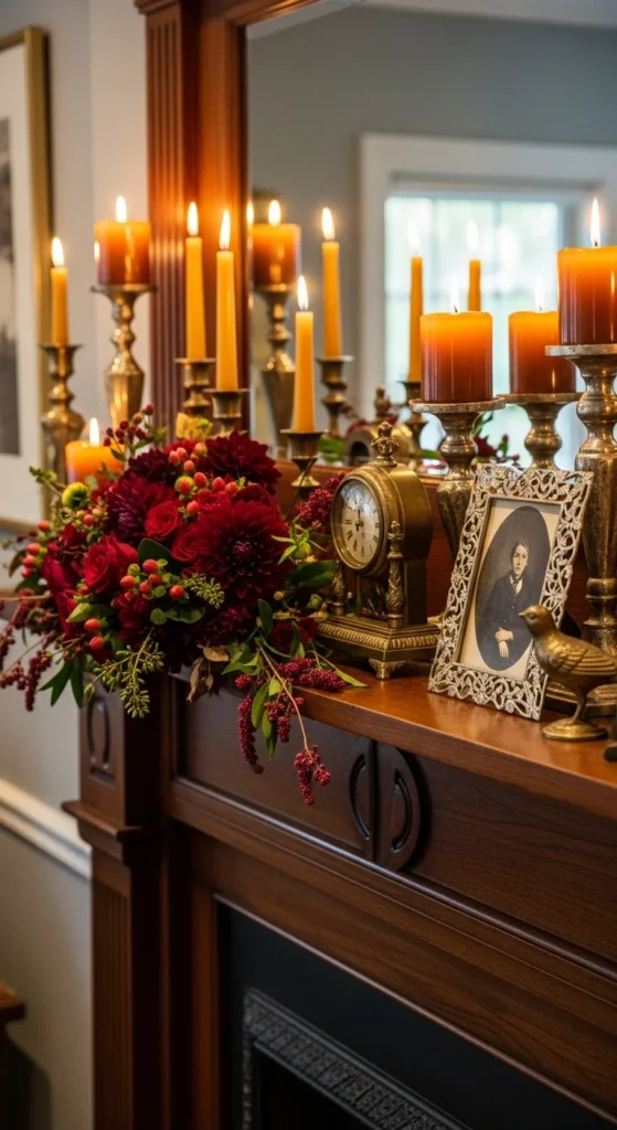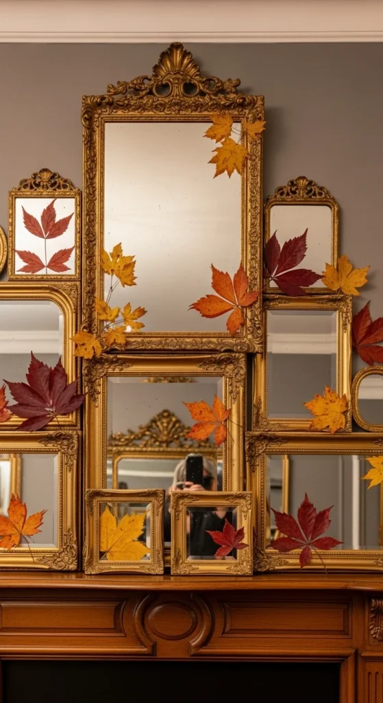 Layer mirrors of various shapes and finishes to bounce warm light around the room. Mix antique gold and wooden frames for depth. Add a touch of fall by tucking dried leaves or pampas stems between frames. This approach makes your mantel feel open and bright, even on cooler, shorter days.
