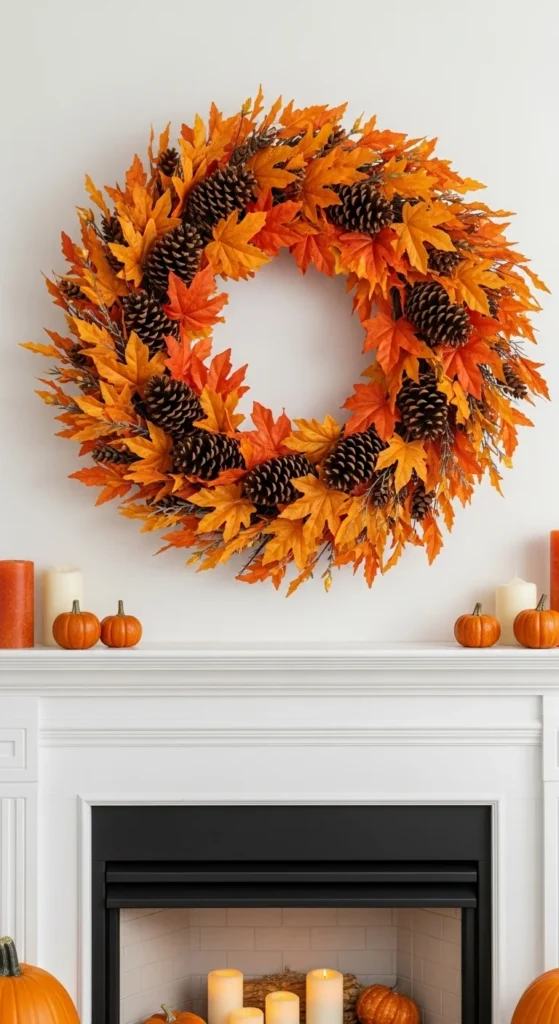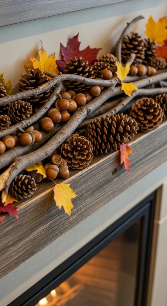 Bring the outdoors in with natural fall elements. Use pinecones, acorns, and dried branches for a simple, earthy display. Arrange them along a wood tray or garland base. Add a few candles or pumpkins to complete the scene. It’s an easy, affordable way to decorate—and you can gather many of the materials right from your yard.