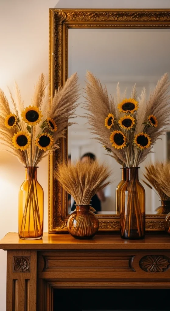 Dried florals are perfect for fall since they last all season. Choose warm-toned flowers like marigolds, wheat, or sunflowers. Arrange them in glass or ceramic vases and place them on opposite ends of your mantel. They add height, texture, and a soft natural touch.