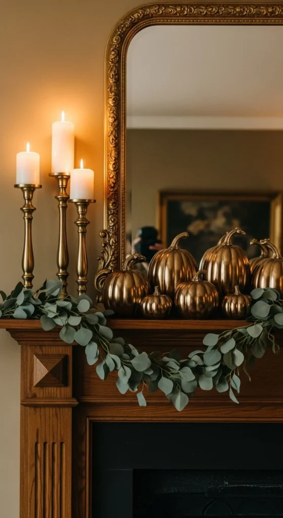 Metallics add elegance without overwhelming the cozy vibe. Pair gold or copper accents with greenery and wood tones. Spray-paint mini pumpkins in metallic hues for an easy DIY upgrade. The shimmer catches candlelight beautifully and adds depth to any fall setup.